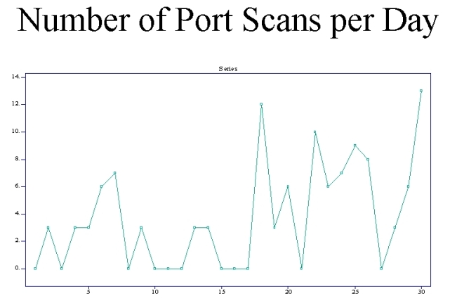 Another area of investigation is to discern the characteristics of certain types of attacks and probes. This second example comes from one of the Honeynet Team's "Scans of the Month". Graph below portrays the number of port scans over a 30 day period. One of the questions we would like to answer is, "What is the typical period of time within which either an attack, further probing or a cessation of activities might be observed" for various probes and pre-attack behaviors. In this case a simple time series ARIMA (Auto Regression Integrated with Moving Averages) model was fitted to the data. ARIMA is a basic model used in time series analysis for looking at data collected over a period of time. The graph below demonstrates the frequency of port scans for the month of November.