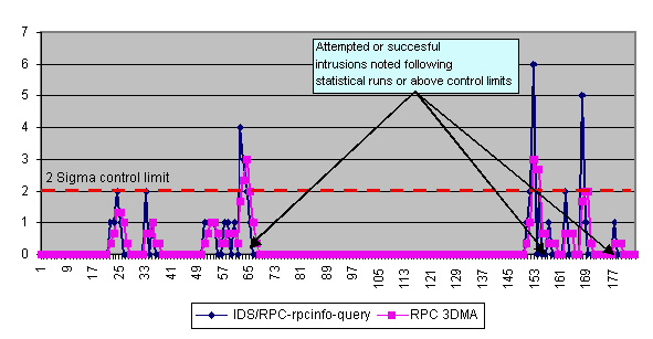 The first was a very basic statistical analysis, similar to the statistical process control methodology used in the manufacturing world to measure defects in a factory setting. This method, although very simple, proved extremely accurate in providing short-term (three days or less), warning notice of impending attacks on the Honeynet. The basic process goes like this: