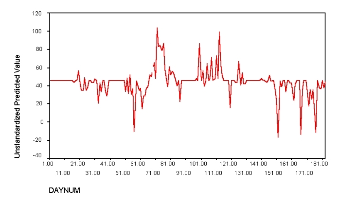 Figure 1 below reveals the predicted number of days until a system compromise with rpc.statd from this model. The horizontal axis represents the date, in days during the sample time, from 1-180. Downward spikes indicate significant activity, predicting an impending attack. This activity, is visible about 10 days before the actual compromise occurs on day 68. Again there are three downward "threat spikes" near the end of the chart before the system is again compromised by the same rpc attack on day 177. We have not yet confirmed what the upward spikes are, preliminary analysis suggests this is 'quiet time' or relatively safe periods.